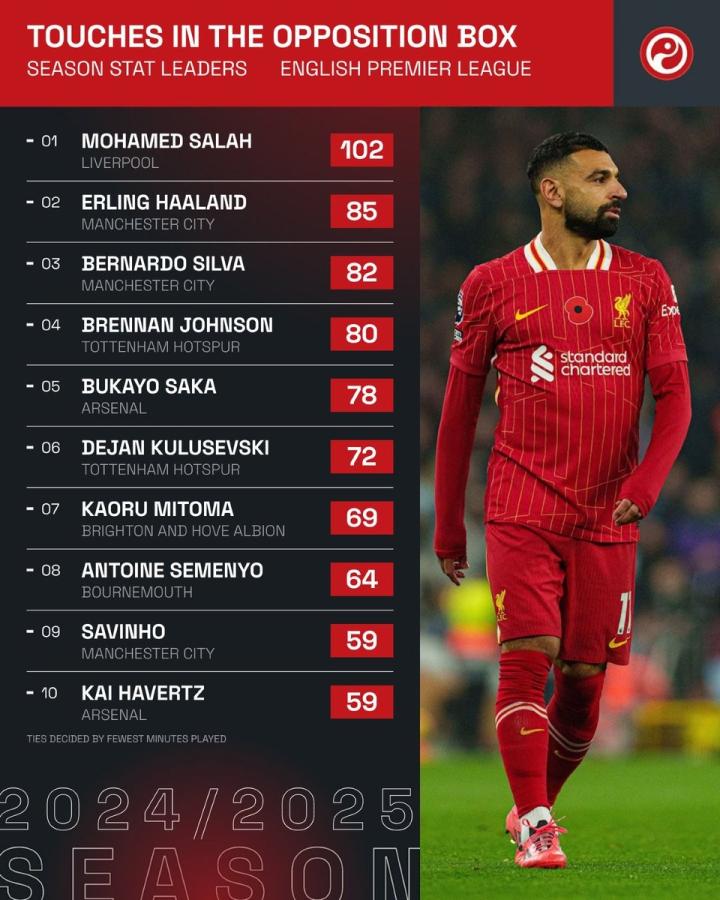 本赛季英超已经展开了11轮激烈的角逐,各支球队的实力尽显,而前场禁区内的触球次数也成为了衡量球员进攻效率的一个重要指标。根据Squawka的统计,萨拉赫、哈兰德和伯纳多-席尔瓦分别以102次、85次和82次的触球次数脱颖而出,他们的表现备受关注。
