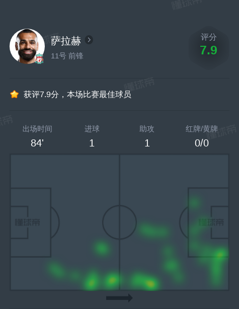 北京时间12月2日,英超焦点战中,利物浦主场对阵曼城。全场比赛中,萨拉赫的表现可圈可点,他在84分钟的出场时间里贡献了1个进球和1次助攻,3次射门中1次射正,以及1次成功的过人,展现出了出色的个人能力。